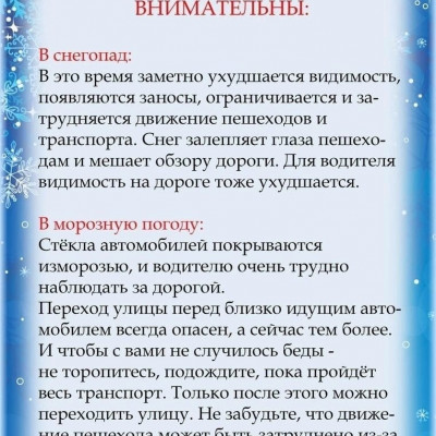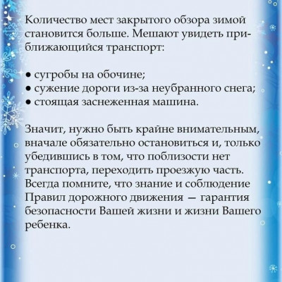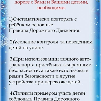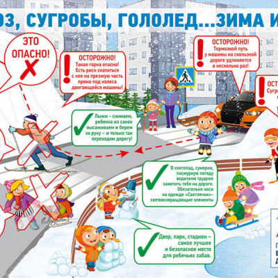 Соблюдайте правила дорожного движения. Помните, что зимняя дорога опасна. Не играйте близи проезжей части дорог, ж/д полотна, водоёмах; не выходите на лёд.