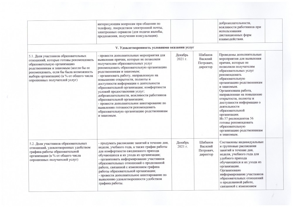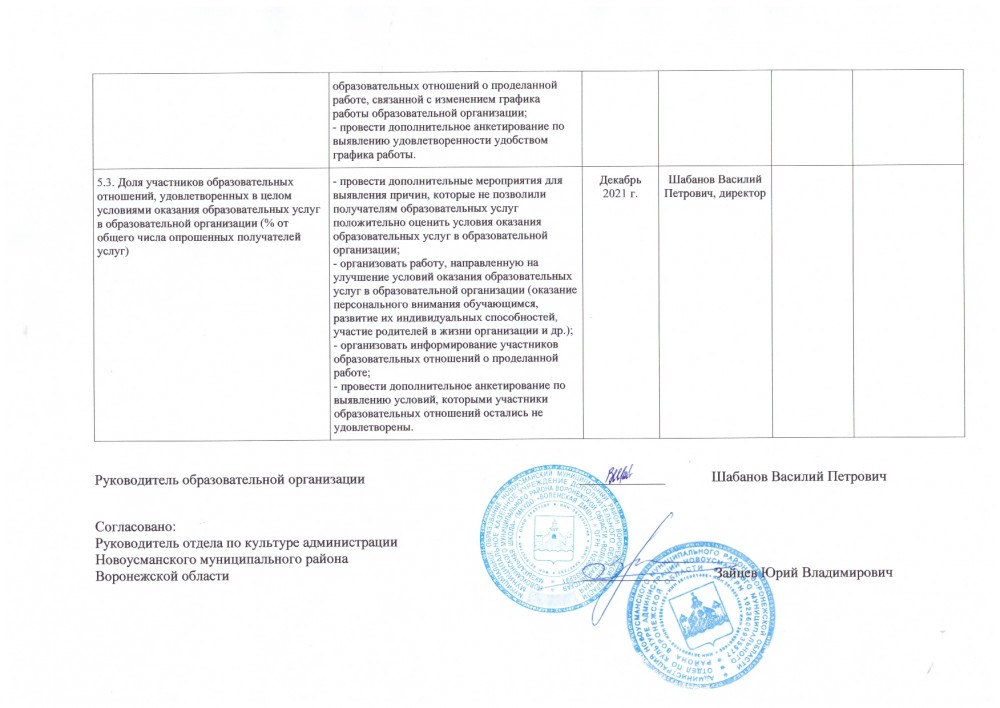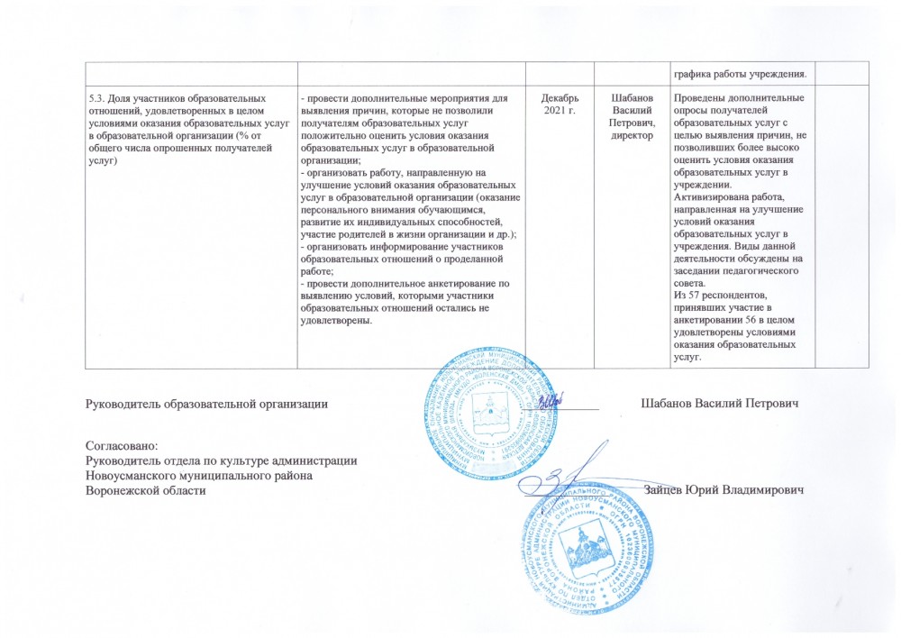 5.3. Доля участников образовательных отношений, удовлетворенных в целом условиями оказания образовательных услуг в образовательной организации (% от общего числа опрошенных получателей услуг) | Максимальный показатель 50 баллов, фактичеки 49,19. - провести дополнительные мероприятия для выявления причин, которые не позволили получателям образовательных услуг положительно оценить условия оказания образовательных услуг в образовательной организации; - организовать работу, направленную на улучшение условий оказания образовательных услуг в образовательной организации (оказание персонального внимания обучающимся, развитие их индивидуальных способностей, участие родителей в жизни организации и др.); - организовать информирование участников образовательных отношений о проделанной работе; - провести дополнительное анкетирование по выявлению условий, которыми участники образовательных отношений остались не удовлетворены. |