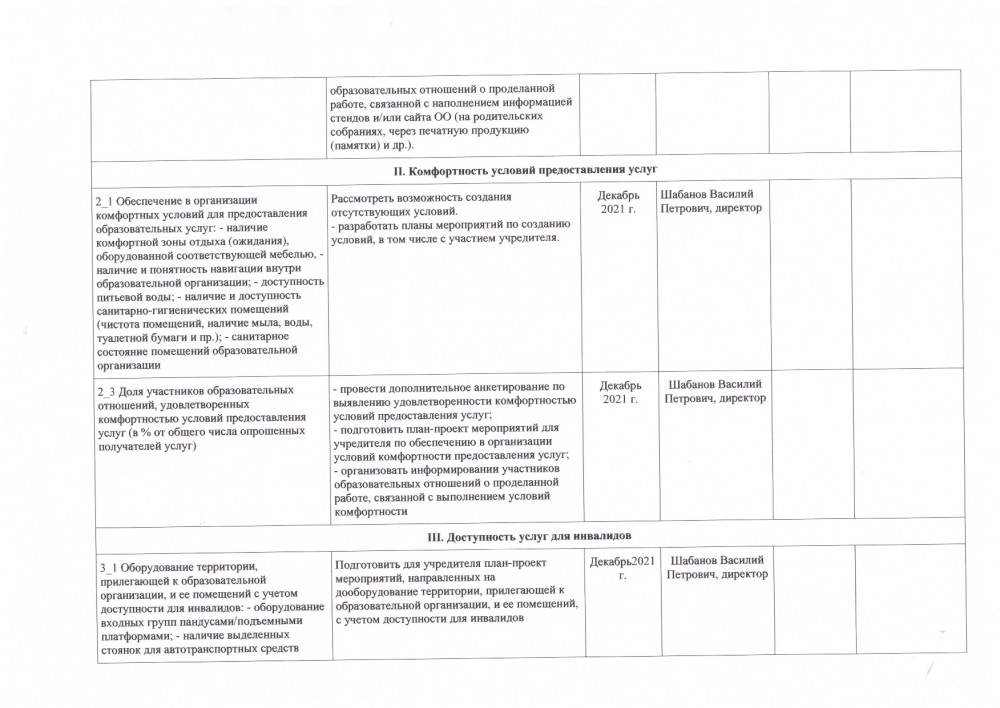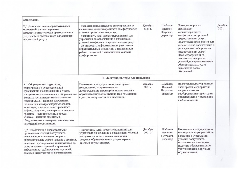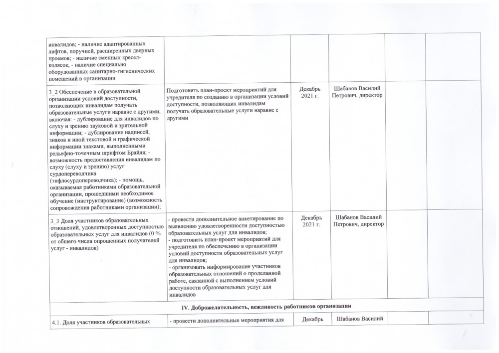 3.1. Оборудование территории, прилегающей к образовательной организации, и ее помещений с учетом доступности для инвалидов: - оборудование входных групп пандусами/подъемными платформами; - наличие выделенных стоянок для автотранспортных средств инвалидов; - наличие адаптированных лифтов, поручней, расширенных дверных проемов; - наличие сменных кресел-колясок, - наличие специально оборудованных санитарно-гигиенических помещений в организации. | Максимальный показатель 30 баллов, фактически 6. Подготовить для учредителя план-проект мероприятий, направленных на дооборудование территории, прилегающей к образовательной организации, и ее помещений, с учетом доступности для инвалидов. |