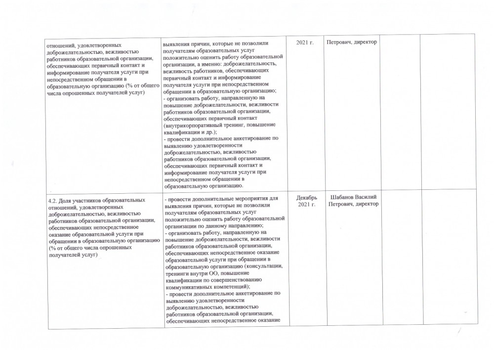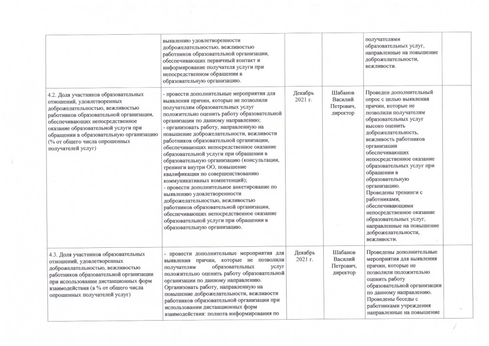 4.2. Доля участников образовательных отношений, удовлетворенных доброжелательностью, вежливостью работников образовательной организации, обеспечивающих непосредственное оказание образовательной услуги при обращении в образовательную организацию (% от общего числа опрошенных получателей услуг) | Максимальный показатель 40 баллов, фактически 38,7. - провести дополнительные мероприятия для выявления причин, которые не позволили получателям образовательных услуг положительно оценить работу образовательной организации по данному направлению; - организовать работу, направленную на повышение доброжелательности, вежливости работников образовательной организации, обеспечивающих непосредственное оказание образовательной услуги при обращении в образовательную организацию (консультации, тренинги внутри ОО, повышение квалификации по совершенствованию коммуникативных компетенций); - провести дополнительное анкетирование по выявлению удовлетворенности доброжелательностью, вежливостью работников образовательной организации, обеспечивающих непосредственное оказание образовательной услуги при обращении в образовательную организацию. |