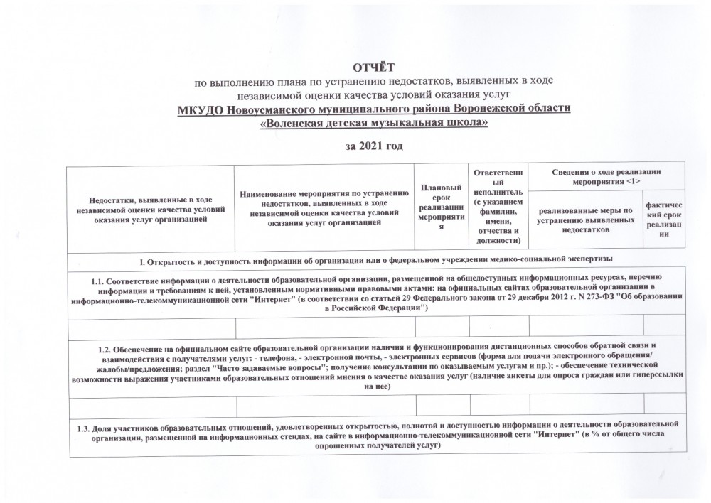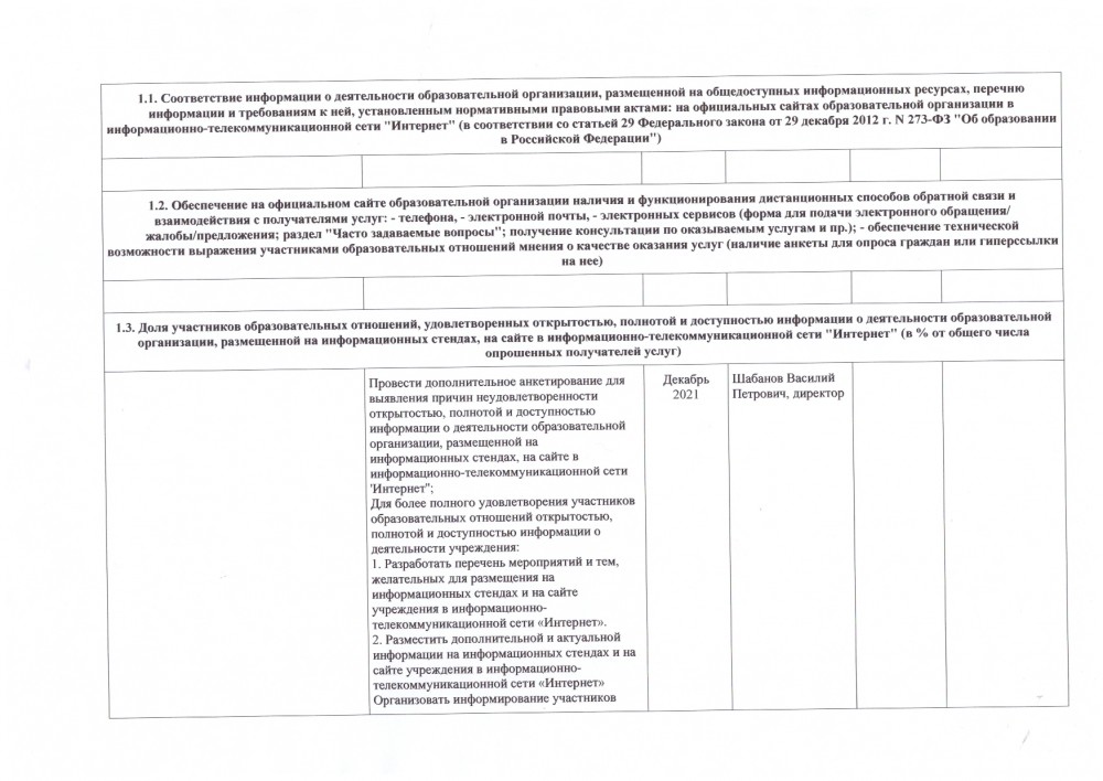 1.3. Доля участников образовательных отношений, удовлетворенных открытостью, полнотой и доступностью информации о деятельности образовательной организации, размещенной на информационных стендах, на сайте в информационно-телекоммуникационной сети "Интернет" (в % от общего числа опрошенных получателей услуг) | Максимальный показатель 40 баллов, фактически 27,41. Провести дополнительное анкетирование для выявления причин неудовлетворенности открытостью, полнотой и доступностью информации о деятельности образовательной организации, размещенной на информационных стендах, на сайте в информационно-телекоммуникационной сети 'Интернет''; Для более полного удовлетворения участников образовательных отношений открытостью, полнотой и доступностью информации о деятельности учреждения: 1. Разработать перечень мероприятий и тем, желательных для размещения на информационных стендах и на сайте учреждения в информационно-телекоммуникационной сети «Интернет». 2. Разместить дополнительной и актуальной информации на информационных стендах и на сайте учреждения в информационно-телекоммуникационной сети «Интернет» Организовать информирование участников образовательных отношений о проделанной работе, связанной с наполнением информацией стендов и/или сайта ОО (на родительских собраниях, через печатную продукцию (памятки) и др.). |