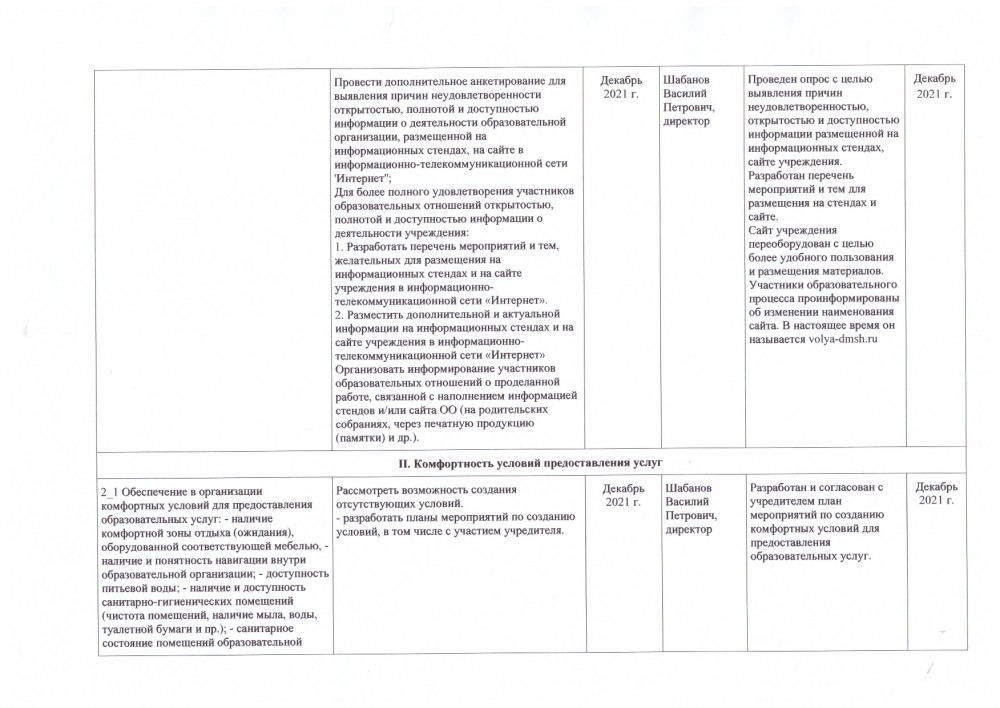 2.3. Доля участников образовательных отношений, удовлетворенных комфортностью условий предоставления услуг (в % от общего числа опрошенных получателей услуг). | Максимальный показатель 50 баллов, фактически 39,51 балла. - провести дополнительное анкетирование по выявлению удовлетворенности комфортностью условий предоставления услуг; - подготовить план-проект мероприятий для учредителя по обеспечению в организации условий комфортности предоставления услуг; - организовать информирование участников образовательных отношений о проделанной работе, связанной с выполнением условий комфортности. |