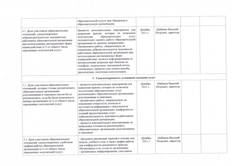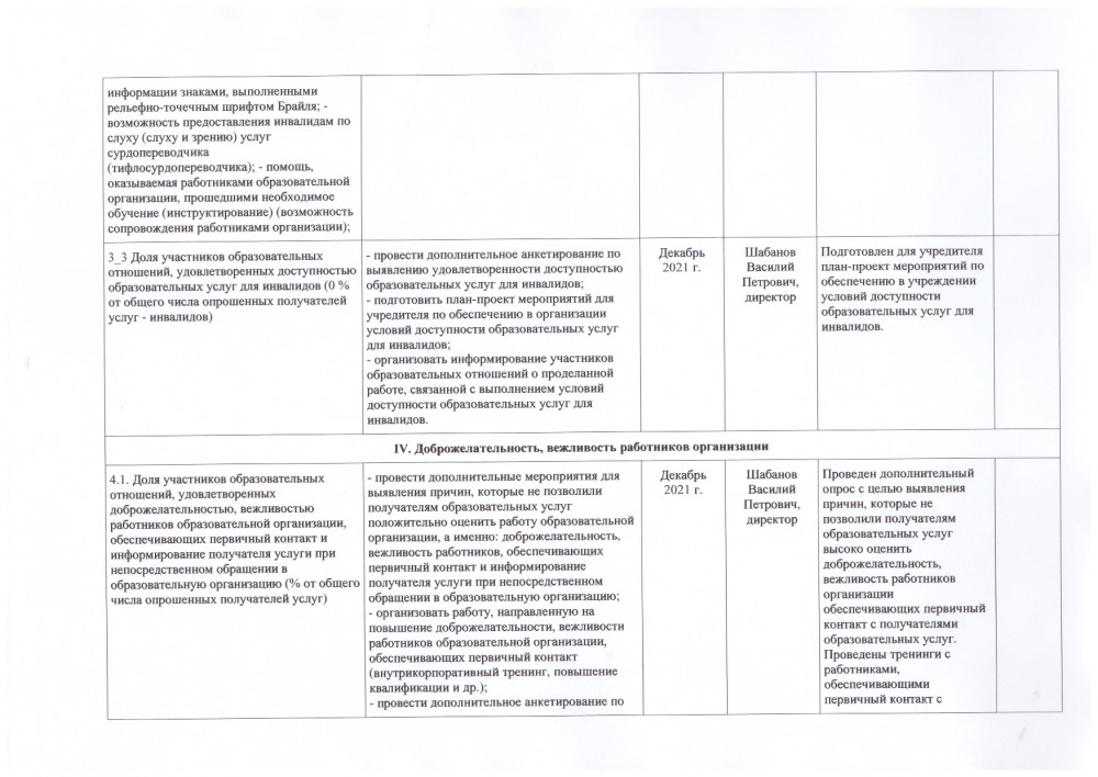 4.1. Доля участников образовательных отношений, удовлетворенных доброжелательностью, вежливостью работников образовательной организации, обеспечивающих первичный контакт и информирование получателя услуги при непосредственном обращении в образовательную организацию (% от общего числа опрошенных получателей услуг) | Максимальный показатель 40 баллов, фактически 39,35. - провести дополнительные мероприятия для выявления причин, которые не позволили получателям образовательных услуг положительно оценить работу образовательной организации, а именно: доброжелательность, вежливость работников, обеспечивающих первичный контакт и информирование получателя услуги при непосредственном обращении в образовательную организацию; - организовать работу, направленную на повышение доброжелательности, вежливости работников образовательной организации, обеспечивающих первичный контакт (внутрикорпоративный тренинг, повышение квалификации и др.); - провести дополнительное анкетирование по выявлению удовлетворенности доброжелательностью, вежливостью работников образовательной организации, обеспечивающих первичный контакт и информирование получателя услуги при непосредственном обращении в образовательную организацию. |